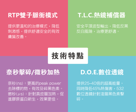 在皮膚病科和一般手術過程也適用於治療黑斑、疤痕色素淡化、治療黑色素病變、血管性病變、太田母斑與移除刺青。