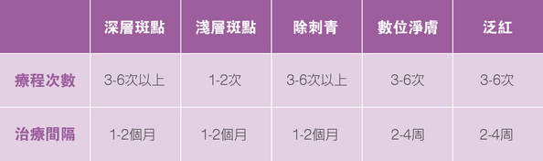 較淺層的斑點治療約1-2次即可去除,但較深層的色素需要大約2-5次,有些症狀還需要更多次的治療,才能達到預期的效果。每次治療前需先觀察皮膚狀況,再選擇當次治療參數。